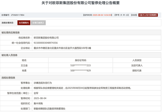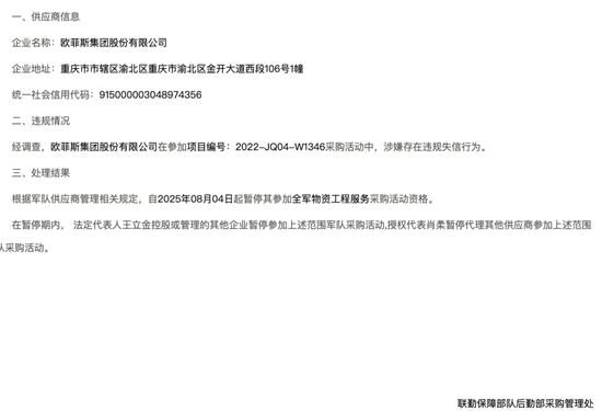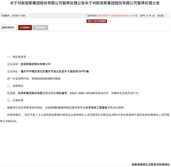 8月4日,联勤保障部队后勤部采购管理处发布公告(处理编号:ZT2025117854),因欧菲斯集团股份有限公司(以下简称“奥菲斯”)在2022-JQ04-W1346采购项目中涉嫌违规失信行为,自2025年8月4日起暂停其参加全军物资工程服务采购活动资格。公告明确,暂停期间,奥菲斯法定代表人王立金控股或管理的其他企业,以及授权代表肖柔代理的其他供应商,均不得参与全军范围内相关采购活动。