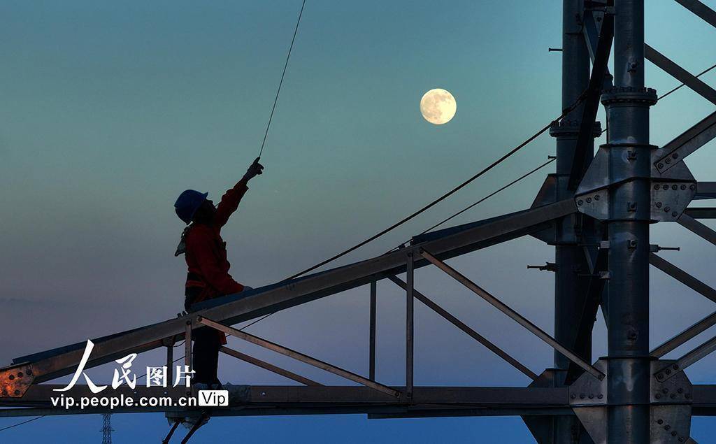 10月6日,在湖南省衡阳市雁峰区南三环路上,施工人员在高塔进行架线施工作业时与圆月同框。曹正平摄(人民图片网)