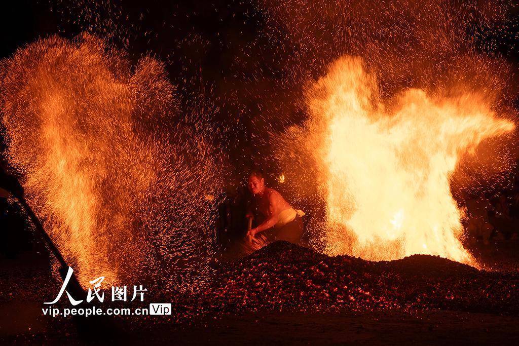 10月6日晚,浙江省金华市磐安县双峰乡,村民在表演“炼火”民俗活动,欢庆中秋佳节。张辉摄(人民图片网)